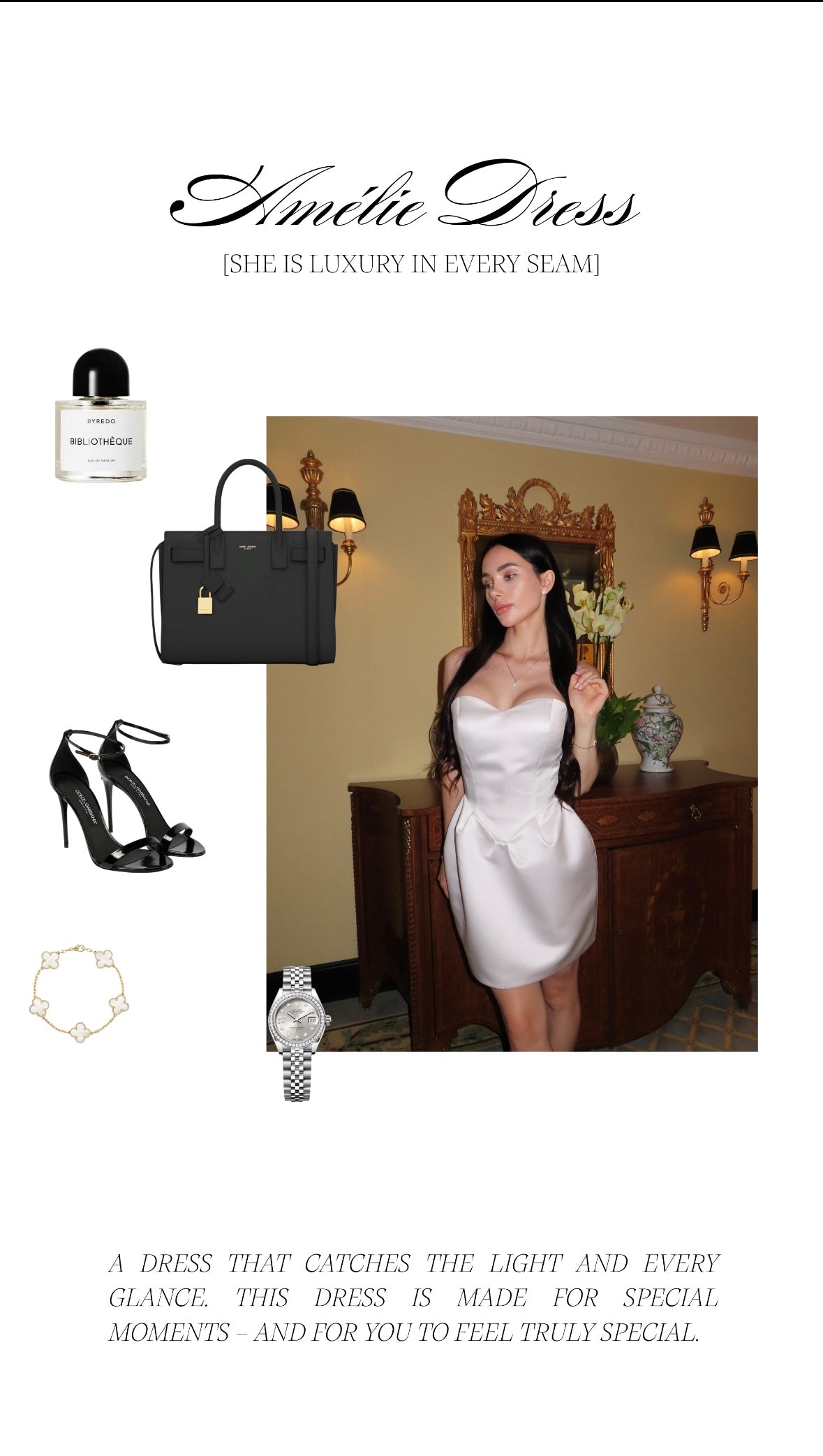 Designed to embrace your silhouette with grace, the Amelie Dress is your ultimate piece for special evenings and timeless memories. With its sculpted corset-style bodice and subtle heart-shaped neckline, it reflects the perfect blend of softness and strength.