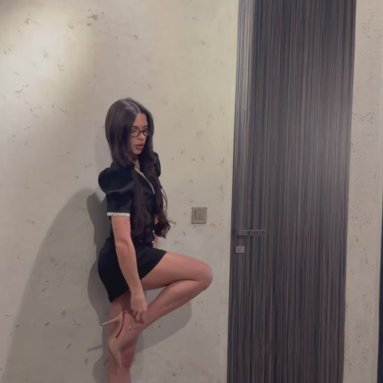 An elegant black mini dress featuring puff sleeves and delicate lace trim along the neckline and cuffs. The fitted silhouette flatters the figure, while the decorative buttons add a touch of sophistication. Perfect for an evening out or a chic date night.